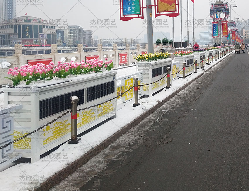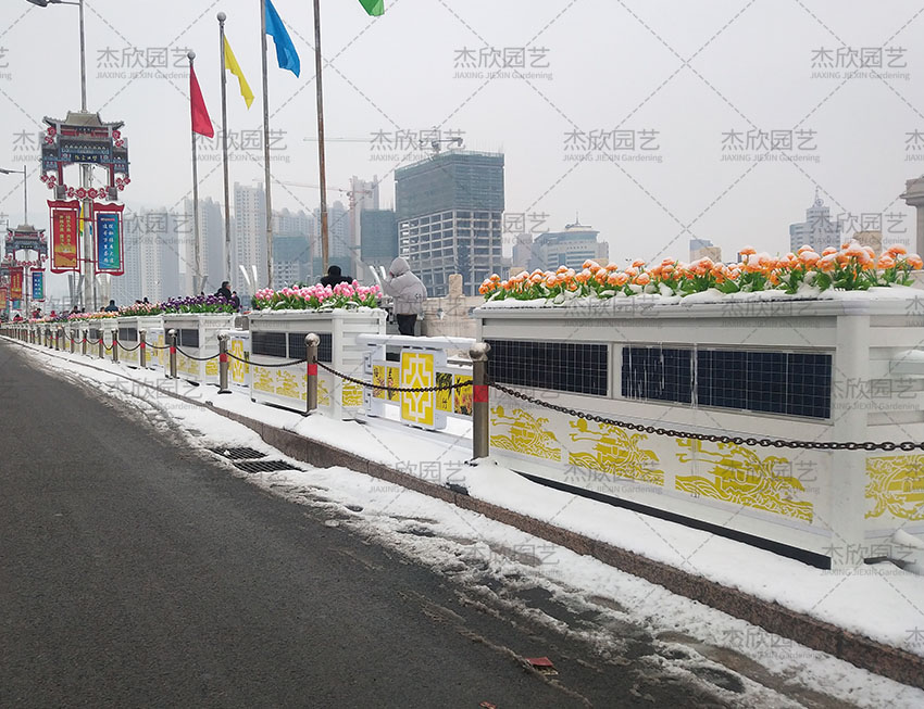 這款智慧花箱,外型設(shè)計(jì)由花箱、護(hù)欄組合,雅典白金色調(diào),增添古典氣息,發(fā)光圖案取自“春江花月夜”,充滿詩情畫意,增強(qiáng)了城市風(fēng)景的大氣感。