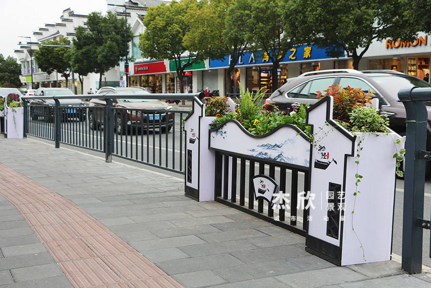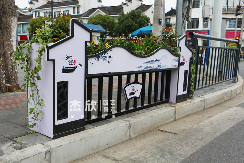 泗涇古鎮(zhèn)也保留了江南傳統(tǒng)文化的韻味,在道路花箱的選擇上,用水墨展現(xiàn)原生態(tài)的江南風(fēng)景。簡(jiǎn)化的馬頭墻、飛檐、窗格,都一一呈現(xiàn)出時(shí)代的美感。黑白看似單調(diào),但其中蘊(yùn)藏著無限的生機(jī),從無到有,從簡(jiǎn)單到豐富,都在意境中得到滿足。