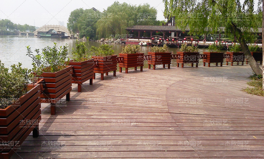 像這個(gè)景點(diǎn),有湖有長廊,有石橋有楊柳,是典型的江南水鄉(xiāng)。那么在花箱顏色上可以選擇紅色,突出古典的色彩。在款式上可以選擇,可以更加端莊秀麗。