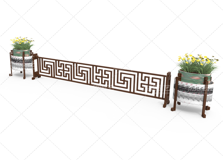 古典道路花箱護(hù)欄舉例而言:千里江山花箱護(hù)欄。花箱圖卷上的是千里江山圖,極盡古典繪畫藝術(shù)的精妙所在。花箱本身似大鼓造型,古典莊重。護(hù)欄部分則將古代傳統(tǒng)紋樣融入進(jìn)去,充滿了古韻詩情。