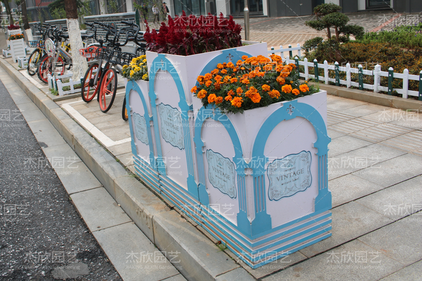 有木紋花箱,也有將文化特色寓于木紋花箱中。有造型花箱,也有將文化特色寓于造型花箱中。