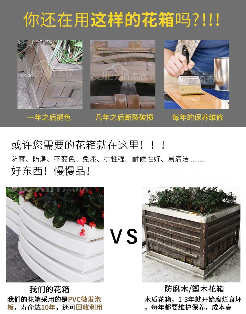 pvc花箱是微發(fā)泡結(jié)皮覆膜,具有防蟲蟻、防日曬的特點,使用多年保持原色。保持了良好的市容市貌。