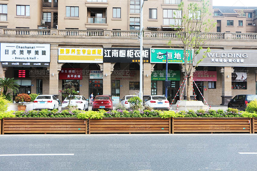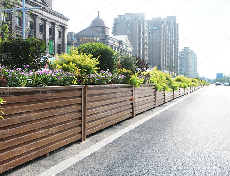黃檀木色花箱和各類植物搭配,起到了道路景觀效果。