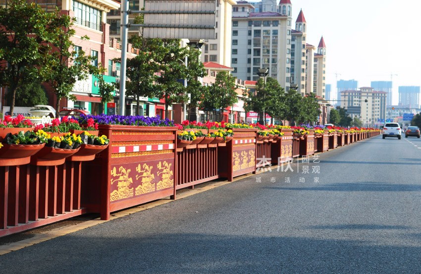 通過傳統(tǒng)朱紅、明黃配色,打造出富有傳統(tǒng)韻味的道路花箱。