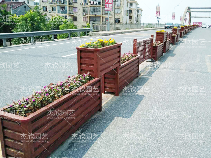 2、擺放式花箱。這里可以分為兩類,一類放在橋梁路面兩側(cè),一類放在橋梁道路中央隔離。